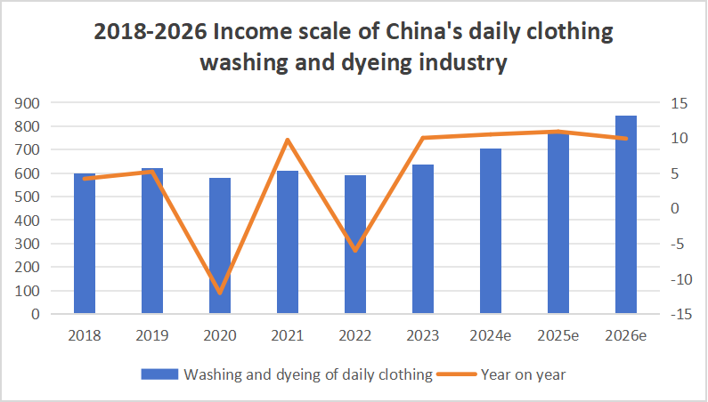 Jako podstawowa część usług zaspokajająca potrzeby codziennego życia ludzi, branża piorąca i farbiarska stale rośnie od zakończenia epidemii, a wielkość rynku stale się zwiększa. W 2023 r. roczny dochód operacyjny Chin mycie a przemysł farbiarski osiągnął 129,06 miliarda juanów. Wśród nich usługi codziennego prania i farbowania odzieży stanowiły 49,4% rocznych przychodów branży, osiągając 63,76 miliarda juanów, co oznacza powrót do poziomu z tego samego okresu w 2019 roku. Według szacunków do 2026 roku roczne przychody branży codziennie sektor prania i farbowania odzieży przekroczy 80 miliardów juanów, przy łącznej stopie wzrostu wynoszącej prawie 10%.